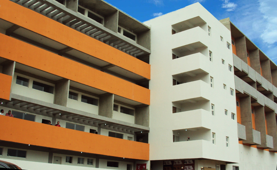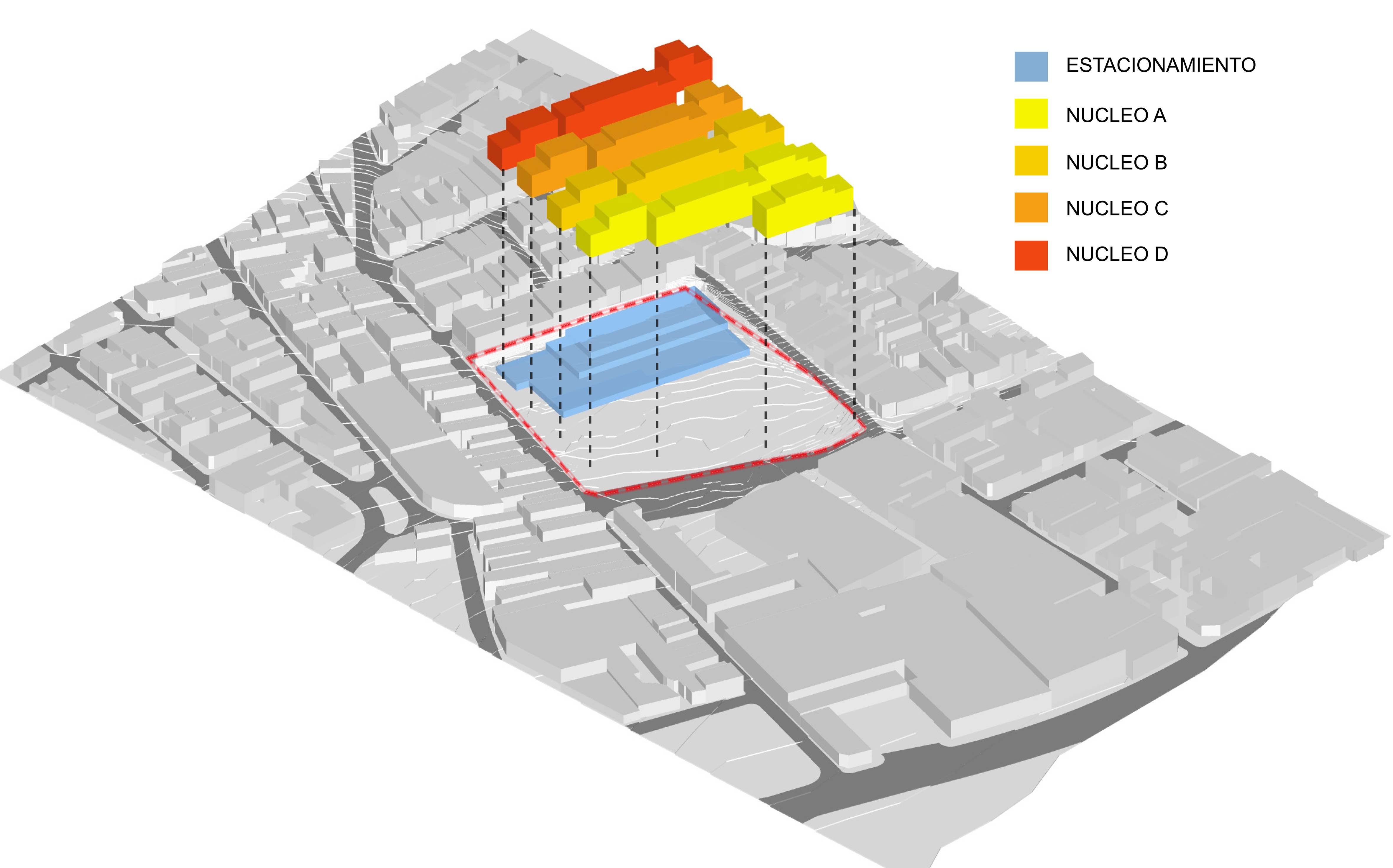 Para estos edificios de viviendas se propuso una conformación longitudinal en sentido noreste-suroeste, garantizando un barrido uniforme del viento en todo el complejo. El conjunto se divide en 4 núcleos, donde cada uno posee 3 edificios (este, centro y oeste) excepto el núcleo A que posee un edificio adicional. Entre los edificios de cada núcleo se forman generosos patios que garantiza una ventilación paralela al sentido del viento. La volumetría de los edificios de cada núcleo es de forma escalonada, decreciendo en los extremos este y oeste para que el perfil urbano sea de menor altura en los bordes de la parcela. Esto generó un diálogo con la escala y el contexto de las calles este y oeste, armonizando con el tejido inmediato en proporciones de ancho y también de altura.