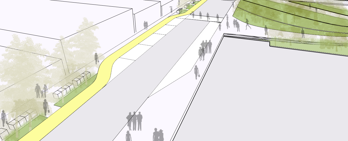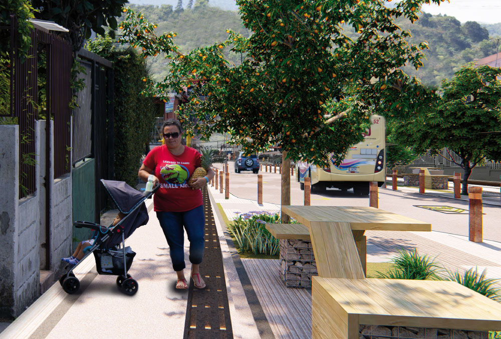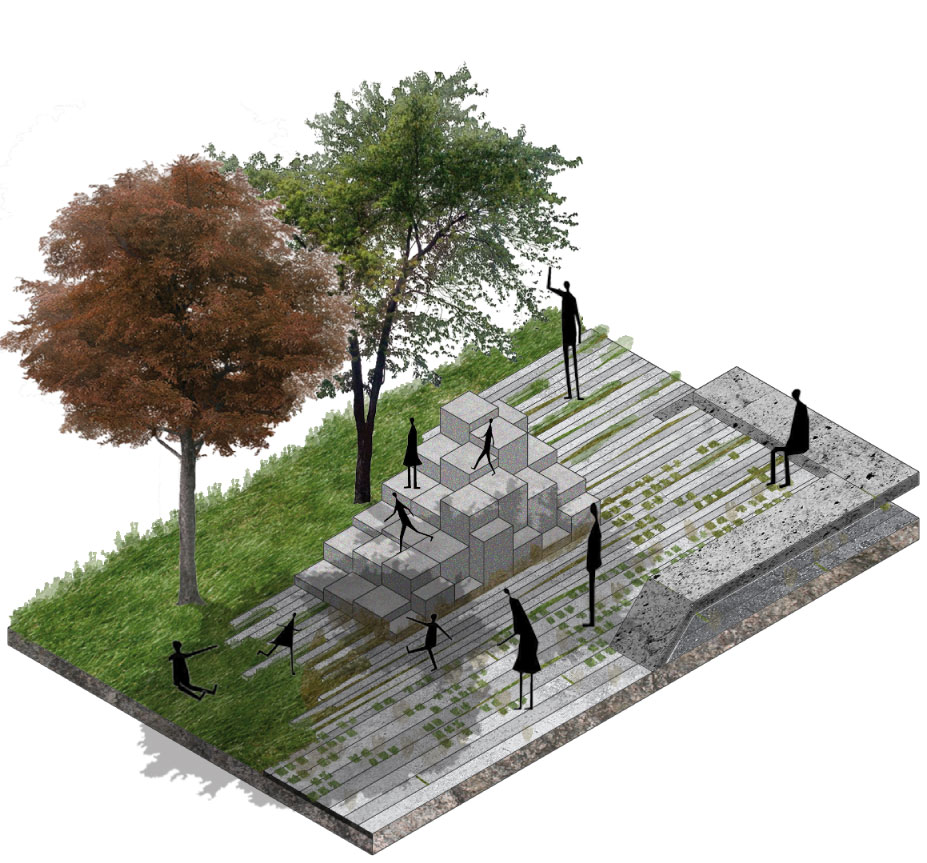 En ese sentido se trabaja la conectividad natural de zonas verdes y espacios naturales hacia el proyecto. Ya sea por eclosión, disrupción, adaptabilidad al entorno artificial o la toma gradual de espacios de oportunidad producto de la entropía urbana, la naturaleza se va abriendo campo. Conceptualmente estas grietas que abren paso a la naturaleza gradualmente evocan un respeto hacia el medioambiente y las tradiciones muy presentes en la memoria y entorno rural costarricense. Por tanto, se busca potenciar espacios verdes y el manejo de biomasa en el espacio público como estrategia gradual y de organización semiótica de la materia traducida en equipamientos urbanos. En la propuesta existen 3 ámbitos reconocibles: