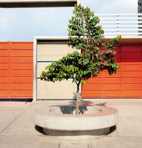 Es un mobiliario basado en líneas curvas. Se plantea como un grande disco de concreto que sirve de contenedor de áreas verdes para colocar arboles medianos o plantas ornamentales, a la vez que sirve de banco para sentarse. Está pensado para ser usado en plazas públicas o privadas de alto tráfico de personas, ya que el banco que es perimetral al árbol sirve para protegerlo. El asiento no posee espaldar, lo que permite que la relación con el área verde sea más directa y que pueda ser usado de múltiples formas por usuarios. Es de concreto armado el cual es un material de bajo mantenimiento y altamente resistente al pasar del tiempo y a las condiciones climáticas en ambientes externos.