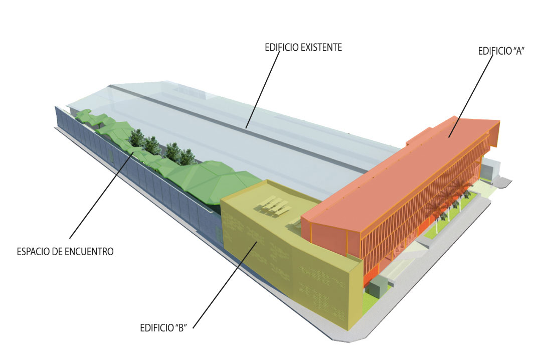 2. Edificio Anexo: Se conforma por dos edificios denominados A y B los cuales se organizan en forma de “L” y que contiene los espacios de servicios necesarios tanto para los compañeros cooperativistas como el público en general. Sirve a su vez de fachada principal y entrada a la feria.
