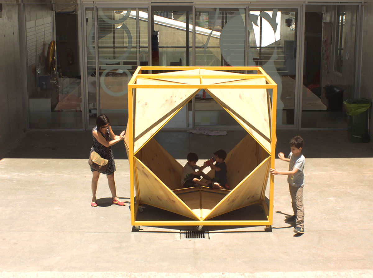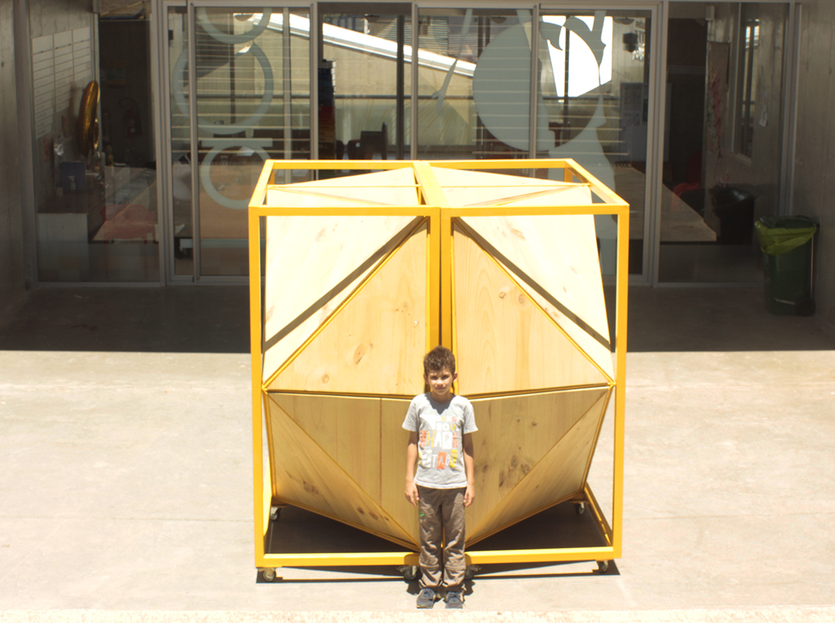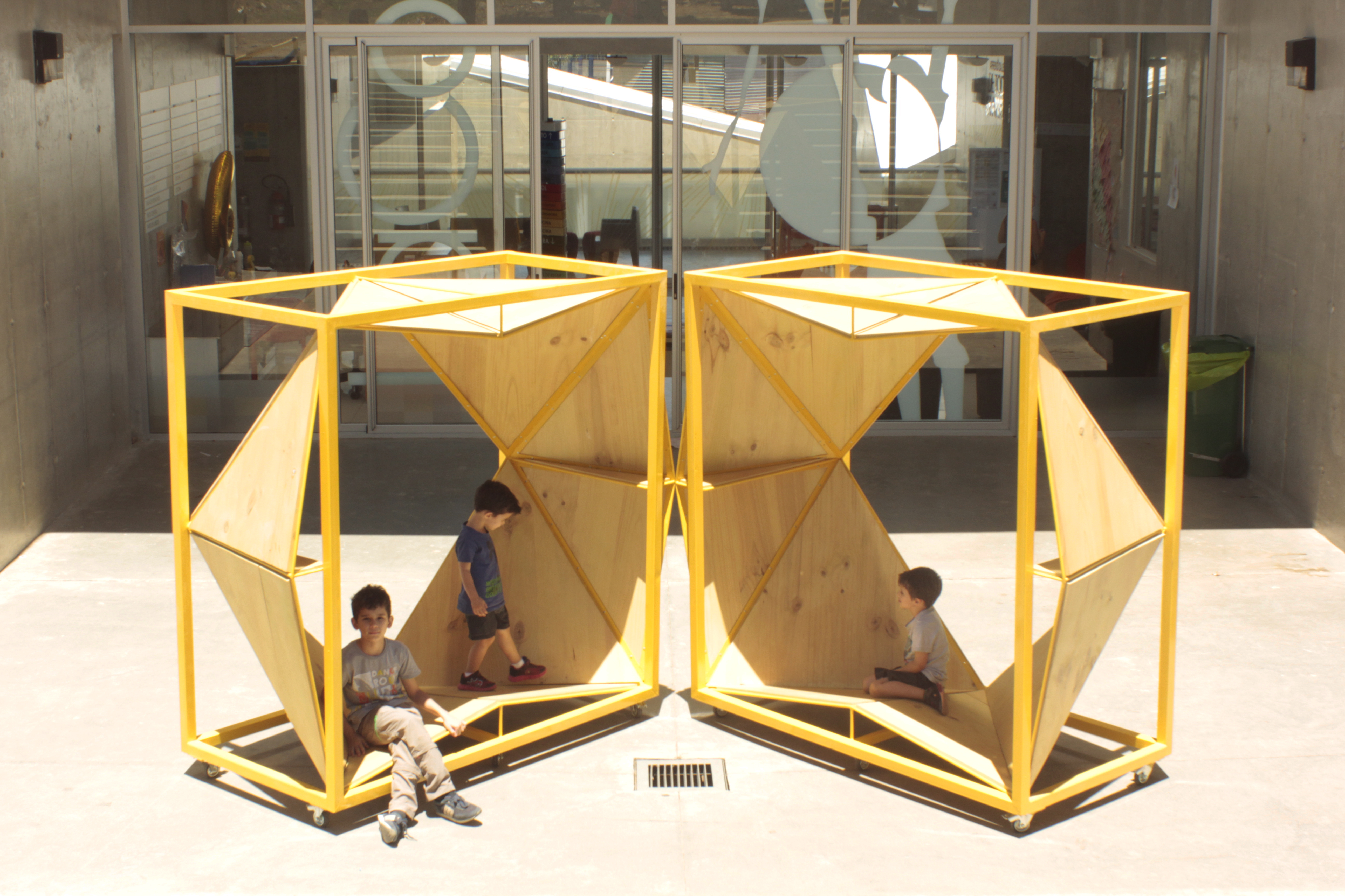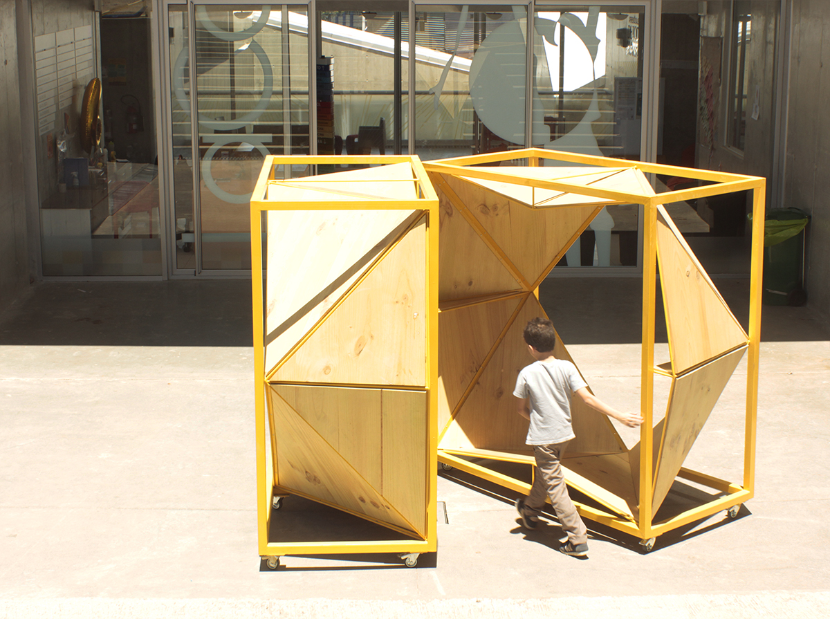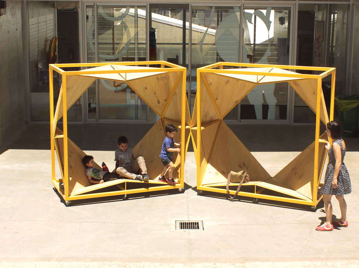Se plantea como módulo móvil de descanso para espacios públicos. Está compuesto por dos primas idénticos conformado por una estructura metálica y con cerramientos de madera de pino radiata en forma triangular. Esta modulación triangular genera variaciones en la superficie permitiendo tener un soporte de asiento y respaldar, los cerramientos laterales y hasta forma la cubierta. Al unir dos Módulo Rex se conforma un cubo perfecto de 2 metros por 2 metros, convirtiéndose en un espacio lúdico y versátil para distinto tipo de usuarios, ya sean niños, jóvenes, adultos o adulto mayor.