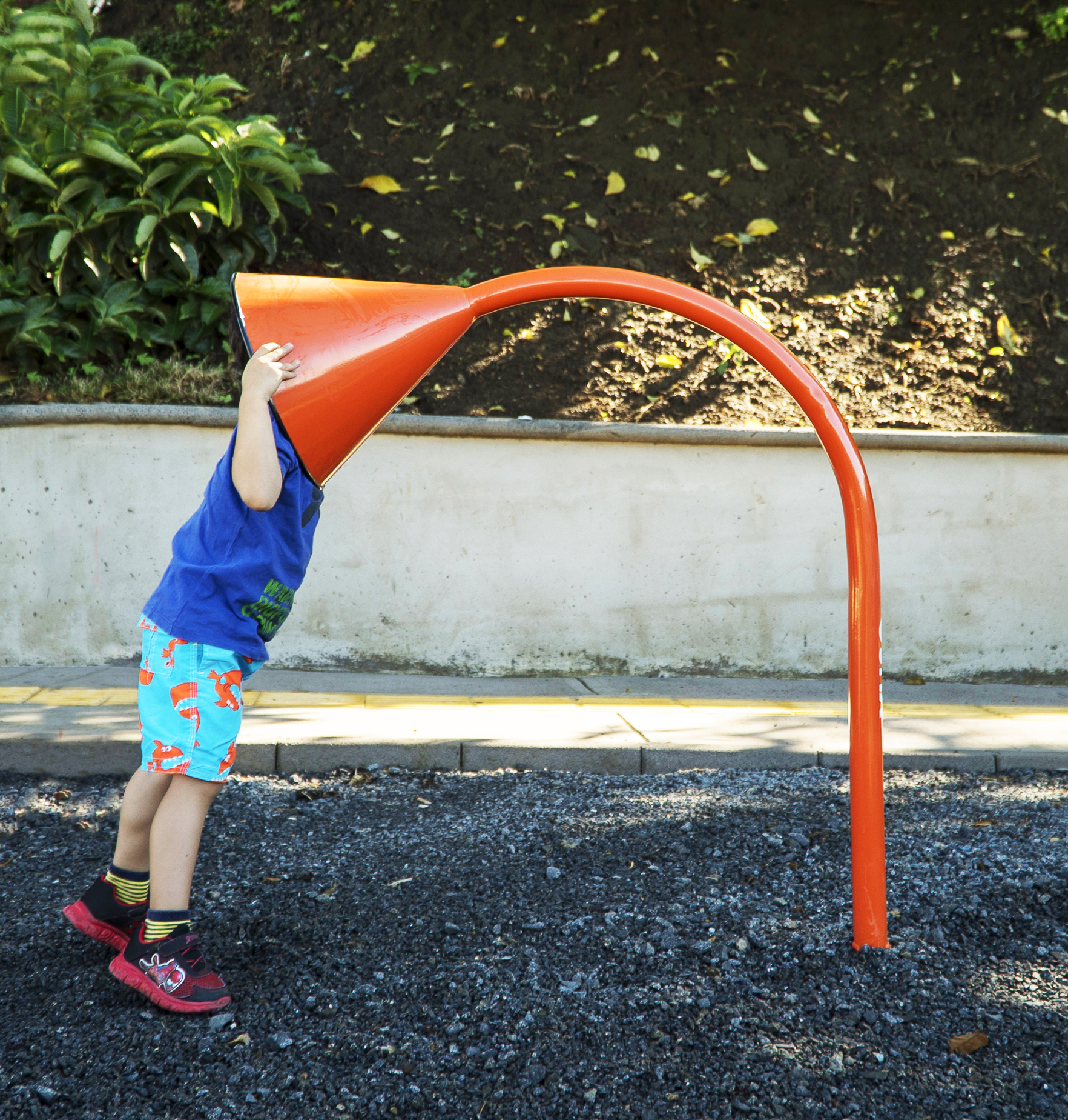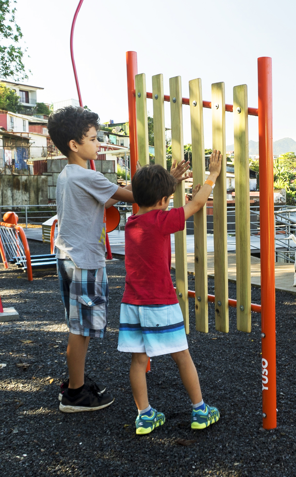 Esta línea de mobiliario de juegos para niños y niñas, está compuesta por 4 piezas cada una con funciones bien diferenciadas con el común denominador de incentivar la imaginación de los niños. Esta conformado por la Rueda donde los chicos pueden a la vez de corren y giran continuamente, esto incentiva la actividad física, el sentido de orientación y las fuerzas en los brazos. El Puente equilibrio donde el niño usa su motricidad gruesa para poder mantenerse en equilibro a la vez que camina. El Teléfono que está compuesto por dos módulos conectados por debajo, donde los chicos pueden comunicarse unos con otros y conversar. Y por último el Xilófono que plantea que el chico experimente sonidos a la vez que juega. A nivel constructivo las 4 piezas la estructura esta fabricadas de hierro galvanizado con pintura electroestática, y el uso de cuerdas, lámina de plástico reciclado y madera de pino.