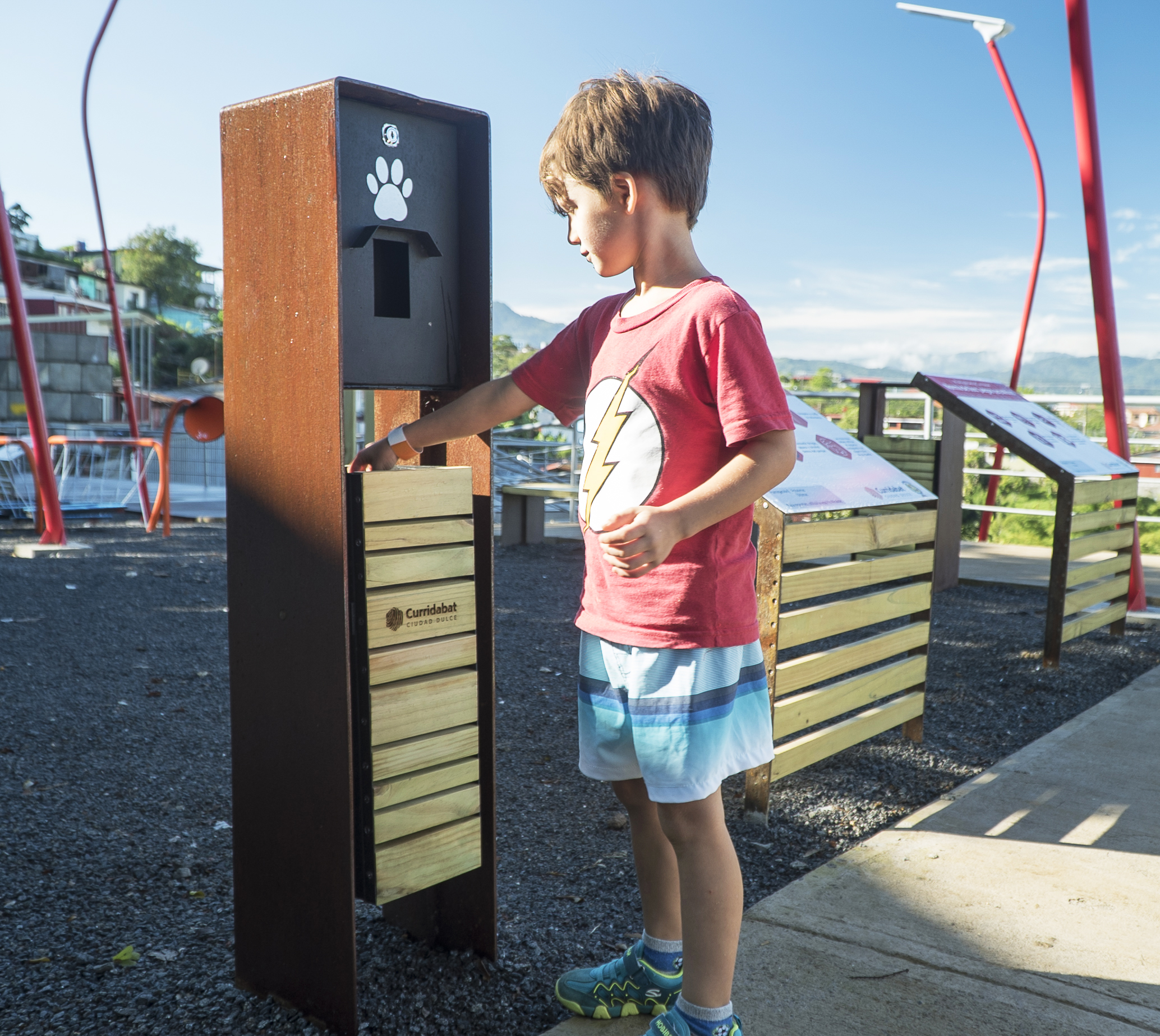 Las robustas láminas de hierro negro con aspecto oxidado que naturalmente posee el acabado de «acero corten», envuelven de lado a lado a la pieza de mobiliario, otorgando protección a las finas piezas de madera que son acomodadas aleatoriamente para darle un componente dinámico al mueble. La función primordial de este elemento, es ayudar a mantener los espacios del cantón limpios de excremento de mascotas, el cual tiene dos funciones; en la parte superior sirve para suministrar bolsas pudiendo facilitar a las personas recoger el excremento de sus mascotas y en la parte inferior posee un contenedor para depositarlas con el excremento. Este mueble se diseñó con dimensiones para poder ser colocado tanto en parques para perros como en las aceras de las vías públicas del Cantón.