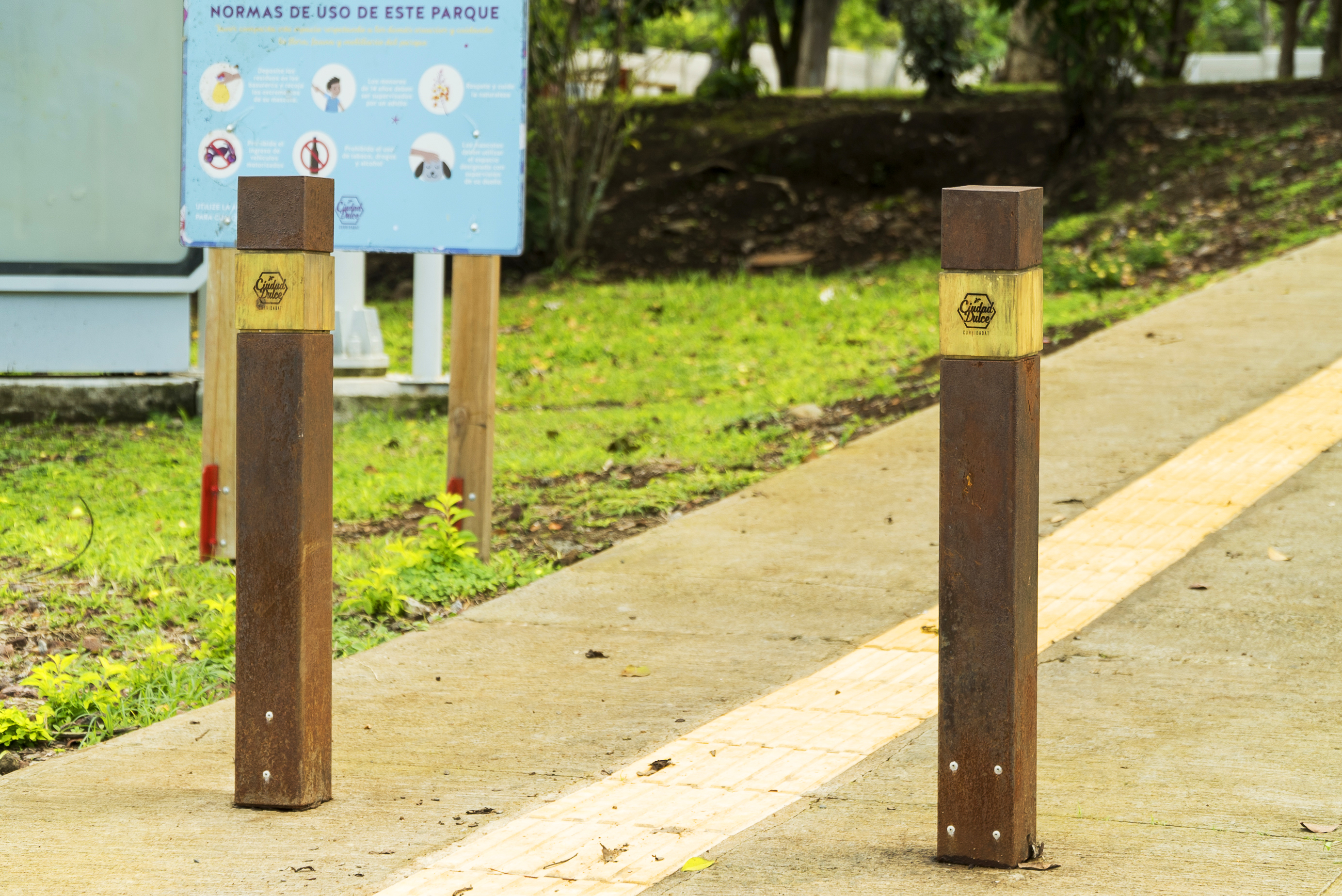 Siendo el mobiliario de mayor frecuencia en el Cantón y que pueda tener un costo asequible, se propone un elemento sencillo y a la vez elegante, compuesto por un tubo de hierro negro con acabado en «acero corten», truncado por un pequeño detalle en madera que alberga la insignia de la Municipalidad de Curridabat. Esta pieza de mobiliario es para ser instalada en los bordes de aceras de las vías, con el fin de evitar que automóviles invadan las zonas de paso exclusiva para los peatones.