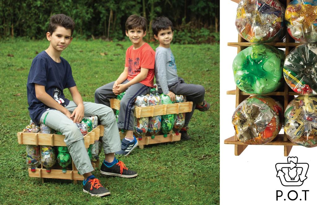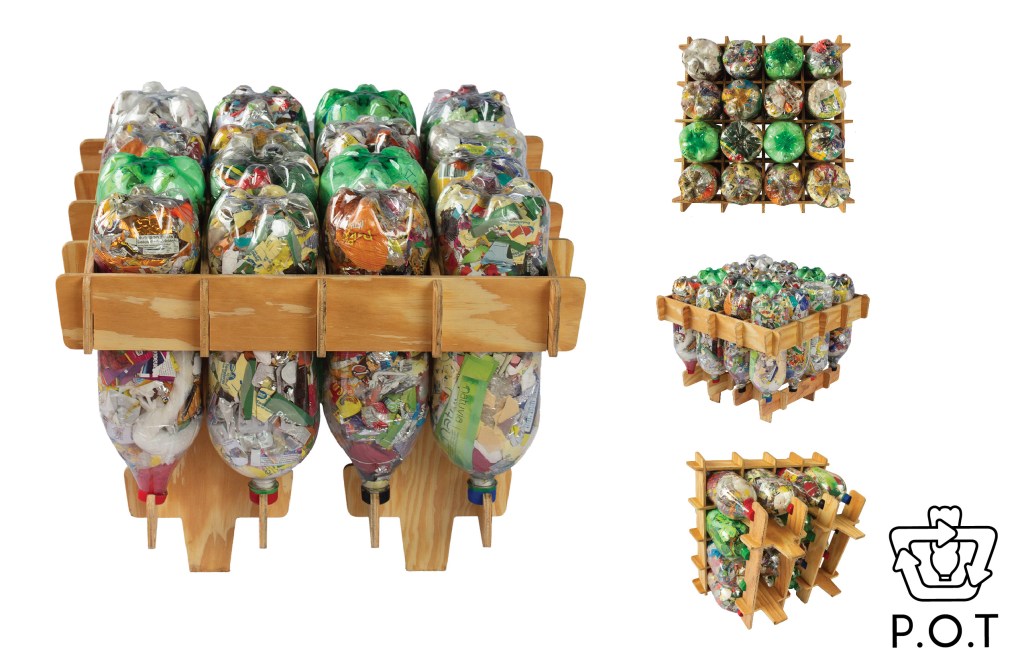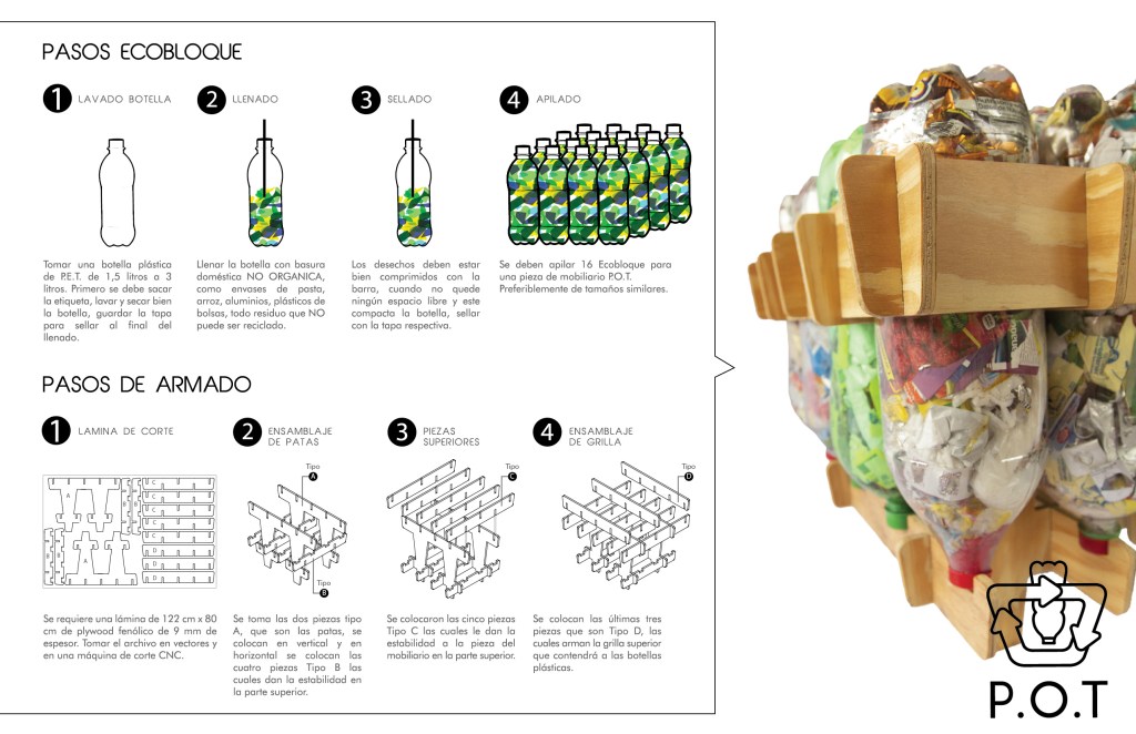 P.O.T es una pieza de mobiliario de “fabricación abierta”, compuesta por una estructura sencilla, ligera y fácil de armar hecha de plywood (tablero contrachapado) cortada mediante fresadora CNC, que sirve de soporte de asiento al colocar a presión dieciséis Eco-bloques (botellas de P.E.T rellenas de desechos no reciclables).