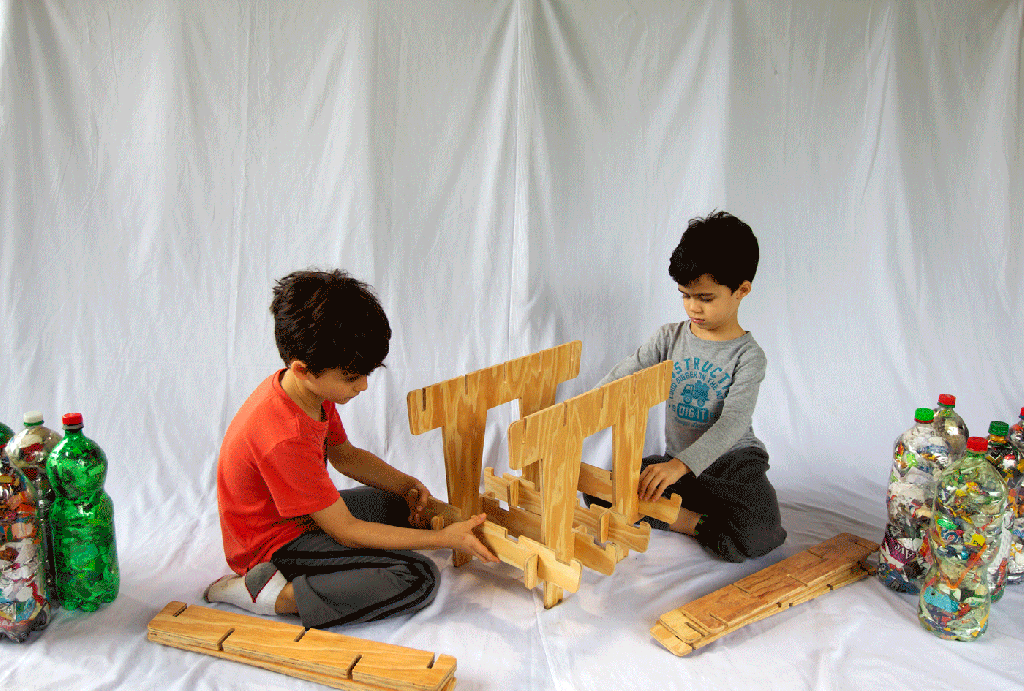 En Costa Rica, varias ONG’s, municipalidades y escuelas, están promoviendo en la comunidad la elaboración de Eco-bloques como un modo de reusar las botellas de plástico y los desechos no reciclables. Sin embargo, no ha quedado claro los usos que se le pueden dar a esos Eco-bloques, con lo cual vimos oportuno diseñar un mobiliario que evidenciara un dispositivo útil, de fácil ensamblaje y manejable para niños, pensado como una pieza de construcción colectiva en escuelas.