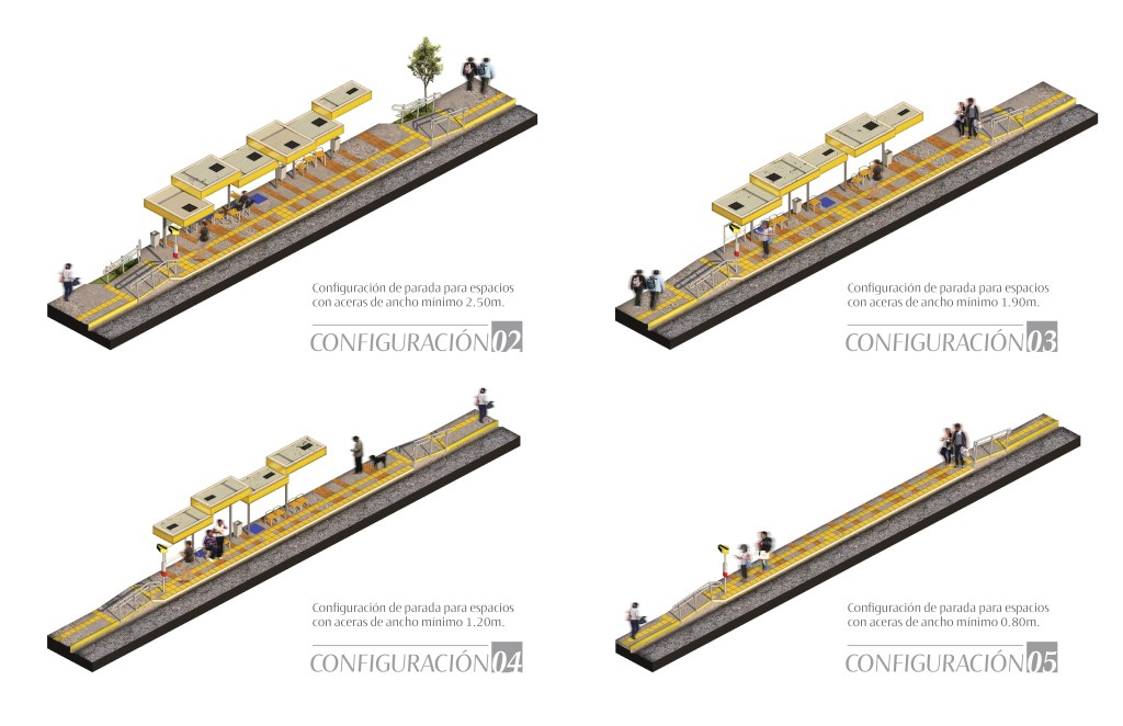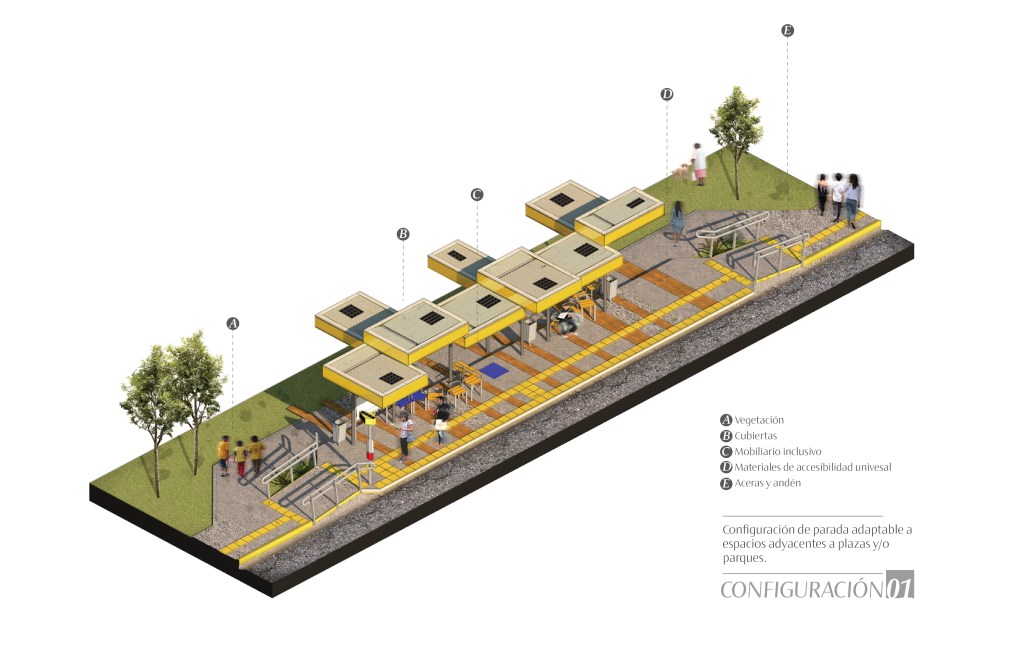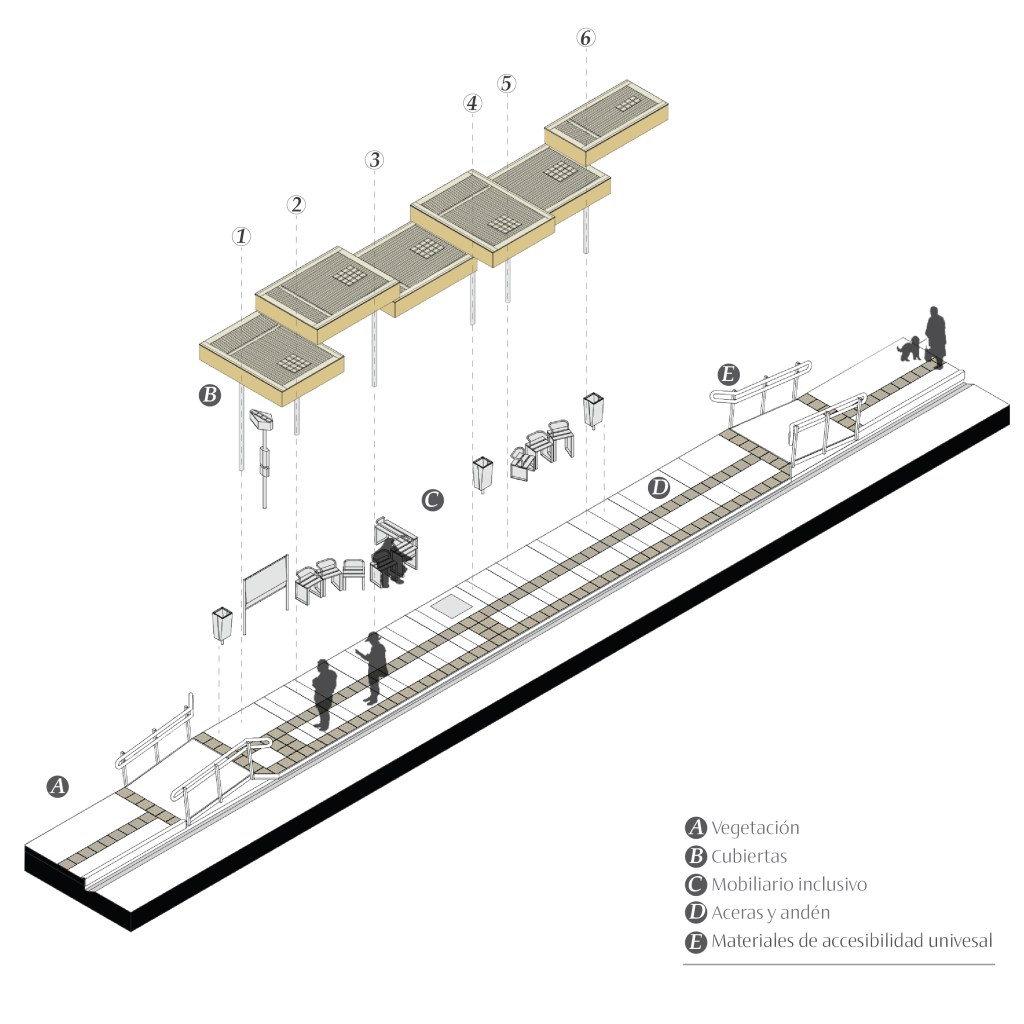 El mobiliario está pensado para adaptarse a distintos tipos de personas, siendo un mobiliario inclusivo.Cuenta con elementos pensados para personas con alguna condición especial, como lo es las rampas, barandas, losetas podotáctil y rótulos informativos en braille. El andén se propone a una altura que permite el acceso a los buses al mismo nivel.