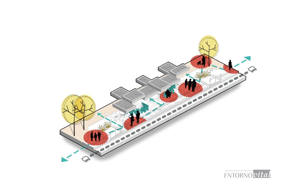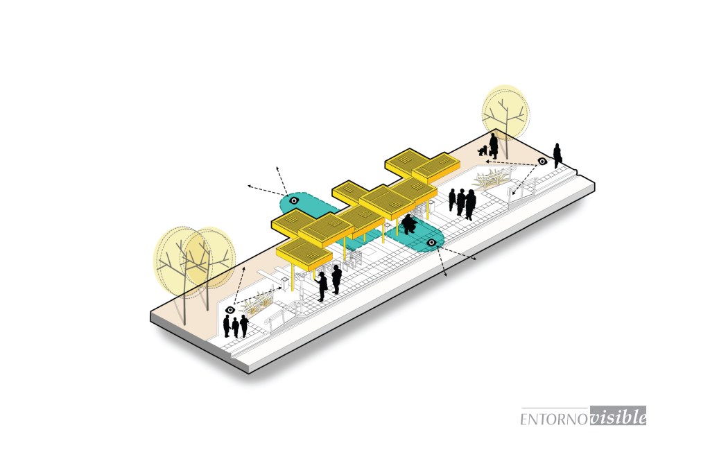Las cubiertas se proponen como un sistema de módulos, que permite adaptarse a distintas conformaciones según el lugar a colocar y a la vez propicia mejores condiciones para espacios de encuentro. A su vez, se propone un mobiliario flexible e independiente de la cubierta, que permite adaptarse a las dinámicas del lugar como piezas aparentemente dispersas, con la intención de brindar dinamismo, facilitando las proliferaciones de actividades más allá de las funcionales. Y, por último, el diseño de la superficie de suelo genera una trama que nos permite variaciones en el espacio urbano de un modo sutil, efectivo y a la vez económico.