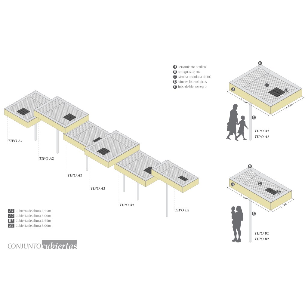 El diseño y composición de las cubiertas está pensado como un elemento estético diferenciador en el contexto, lo que facilita ser visible a la distancia. Mediante la creación de una caja de luz, garantizamos iluminación tanto de la parte inferior como la parte superior de la cubierta, contando con un sistema fotovoltaico que garantiza iluminación independiente y constate. Por otro lado, se propone la mínima cantidad posible de elemento verticales, que obstaculicen la visual periférica, brindando mayor seguridad a las personas. Y junto a esto, se ubica un rótulo con la información de rutas y horarios que permiten conocer los tiempos de espera.
