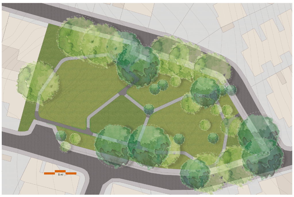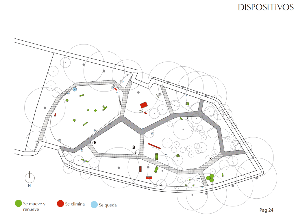 Los senderos serpentean a través de la vegetación, guiando a los y las visitantes a través de diferentes emociones y sensaciones mientras recorren el parque. Para esto se propone una reorganización del terreno, en múltiples parcelas en forma de polígonos irregulares, que fluyen como celdas de una colmena natural, a modo de un “Dulce Enjambre”.