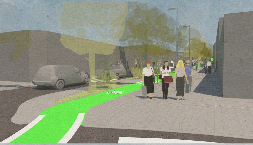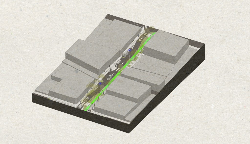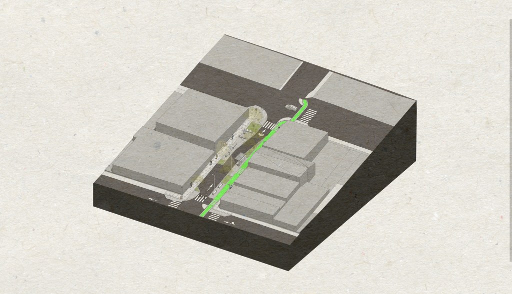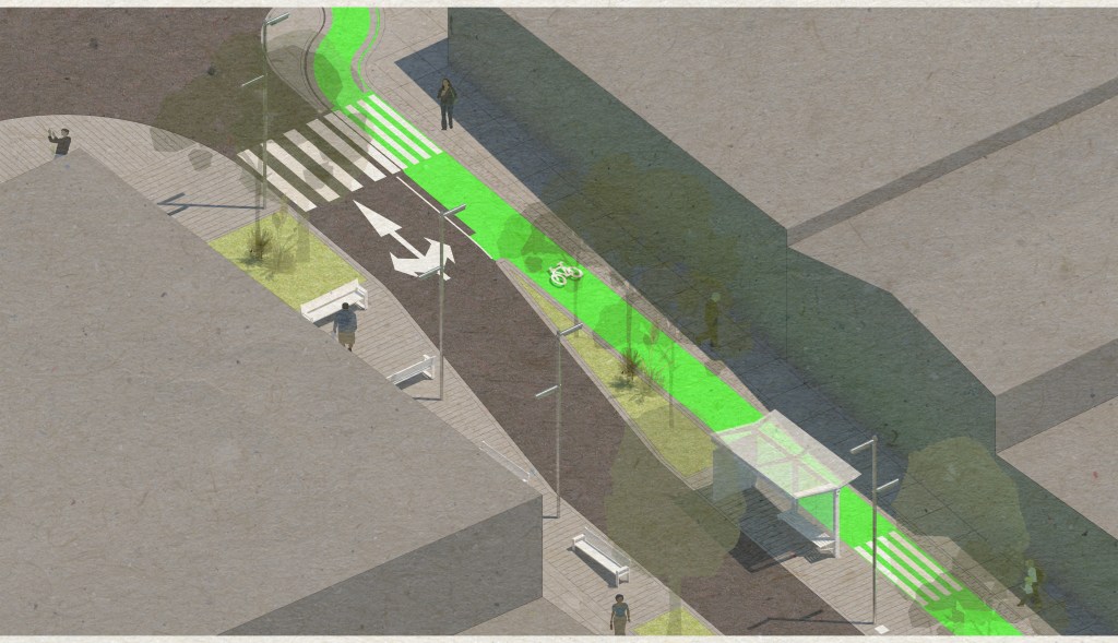 La propuesta se centra en dar respuesta a los dos sectores de la Obra Demostrativa. En cuanto al tramo desde Cinco Esquemas hasta la Municipalidad se centra en desarrollar una dieta de calle que beneficie en gran medida la movilidad activa, sin perjudicar la movilidad de vehículos motorizados. En tal sentido, se formaliza una sola vía para los vehículos motorizados proponiendo sistemas de pacificación que garanticen que no se pueda transitar a velocidades mayores a 30 km/h. Este espacio ganado, permite garantizar una superficie de acera no menor a 1.50 metros y también las bandas multiservicios propuestas, que se destinarán para lugares de permanencia, arborización, parada de buses, comercio al aire libre y la ubicación de zonas de parqueos permitidos.