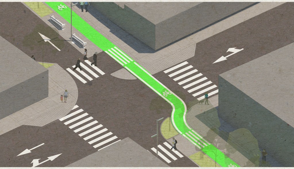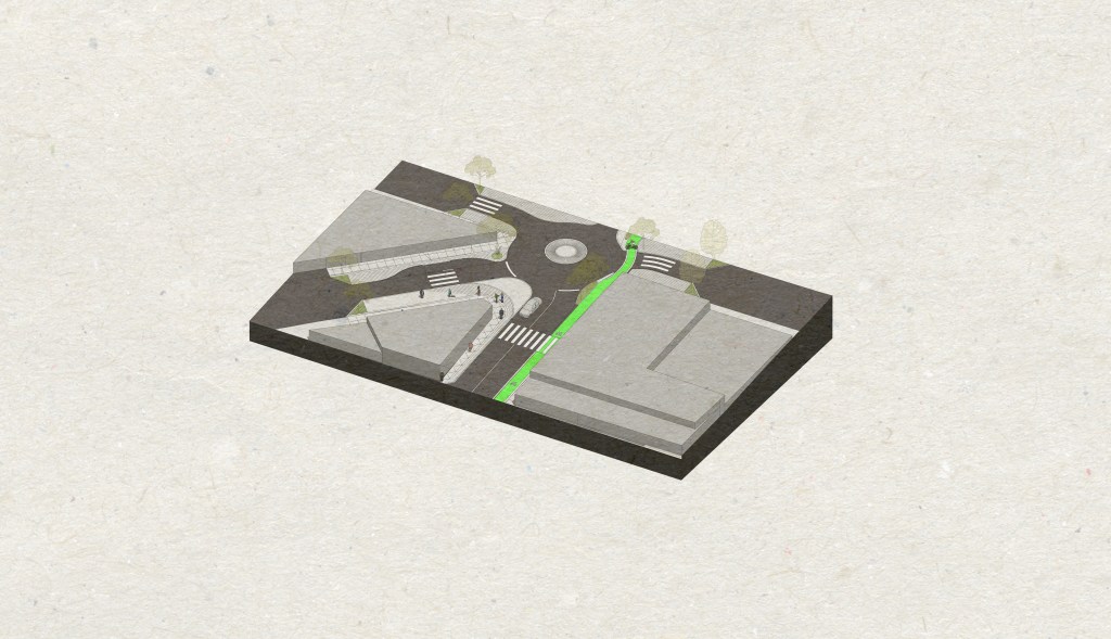 En la intersección de Cinco Esquinas se propone que la Avenida 7 que actualmente es de dos sentidos, se convierta en un solo sentido oeste-este, esto junto con la propuesta de una rotonda que organice de mejor manera el tráfico de vehículos motorizados. Para garantizar los radios de giro de vehículos de emergencia o vehículos de carga, la rotonda tiene la posibilidad de ser rebasada. También se incluye un canal exclusivo para bicicletas que iría sobre toda la Calle La Petra sentido sur-norte donde la pendiente al subir es pronunciada lo que dificulta el trayecto y la seguridad de los ciclistas, no obstante, en sentido contrario con la pendiente de bajada, se propone que el canal sea compartido con los vehículos.
