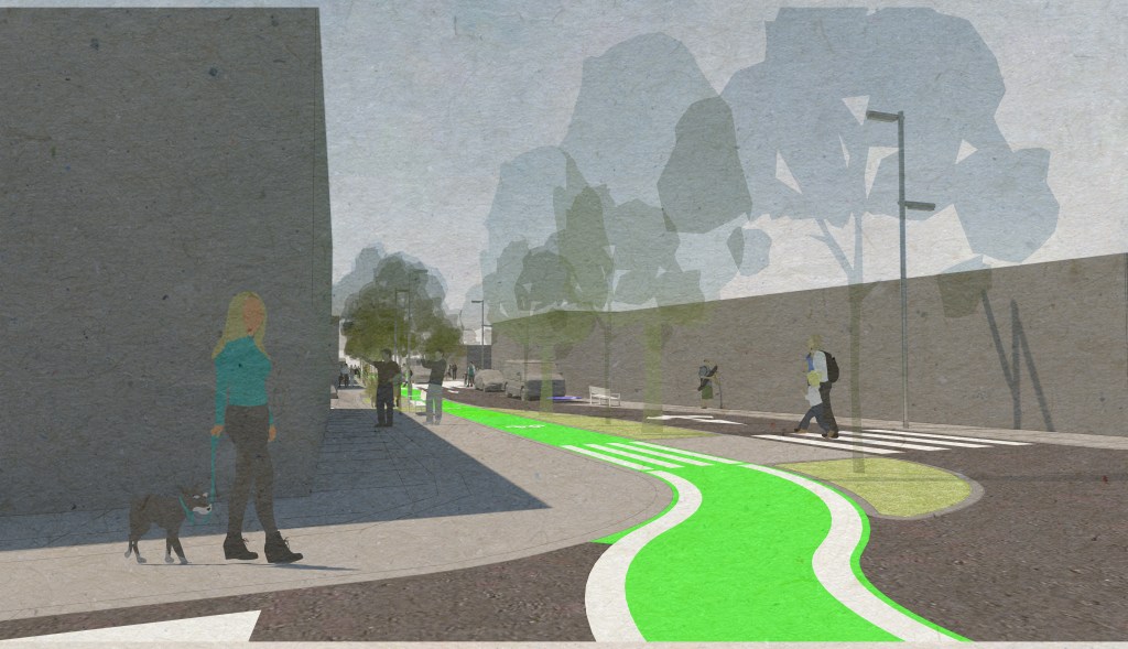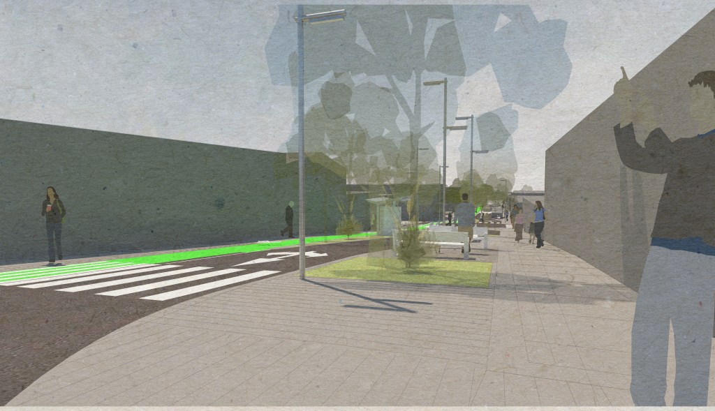 La propuesta a nivel de materialidad propone en la RN 236 que la superficie de rodamiento de vehículos motorizados se mantenga en asfalto, mientras que la superficie de aceras sea en concreto. Ambos pavimentos se proponen al mismo nivel a modo de plataforma única, esto debido a que la acera actual está al mismo nivel que las calles o en algunos casos está por debajo. Se garantiza acceso a todos los garajes existentes en los predios, mediante una rampa que pasa por encima de la acera, sin embargo, se colocan bolardos para garantizar que los vehículos motorizados no aprovechen estas rampas para parquear sobre la acera.